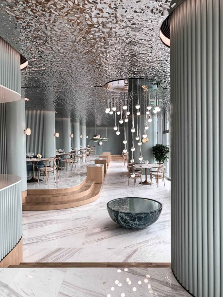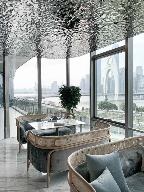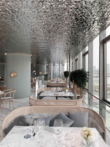 Em interpretação do Rio das Pérolas, no sul da China, o novo restaurante conta com um revestimento metálico no teto que lembra o ondular das águas