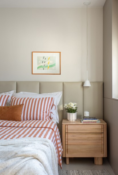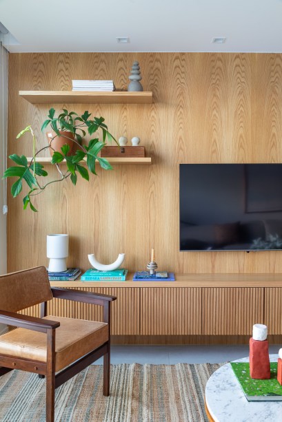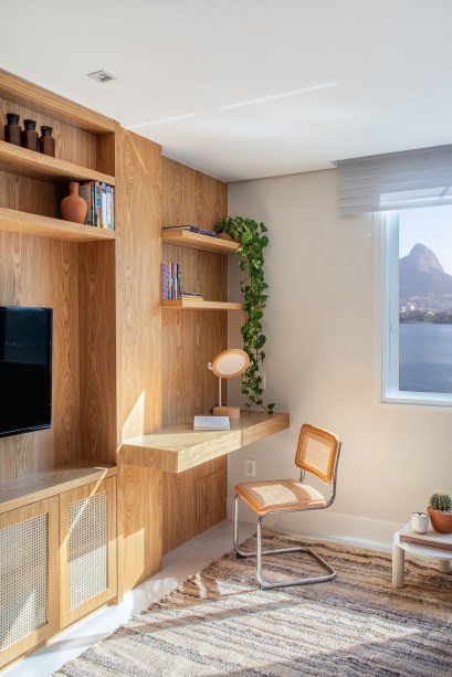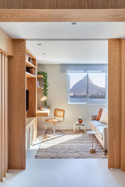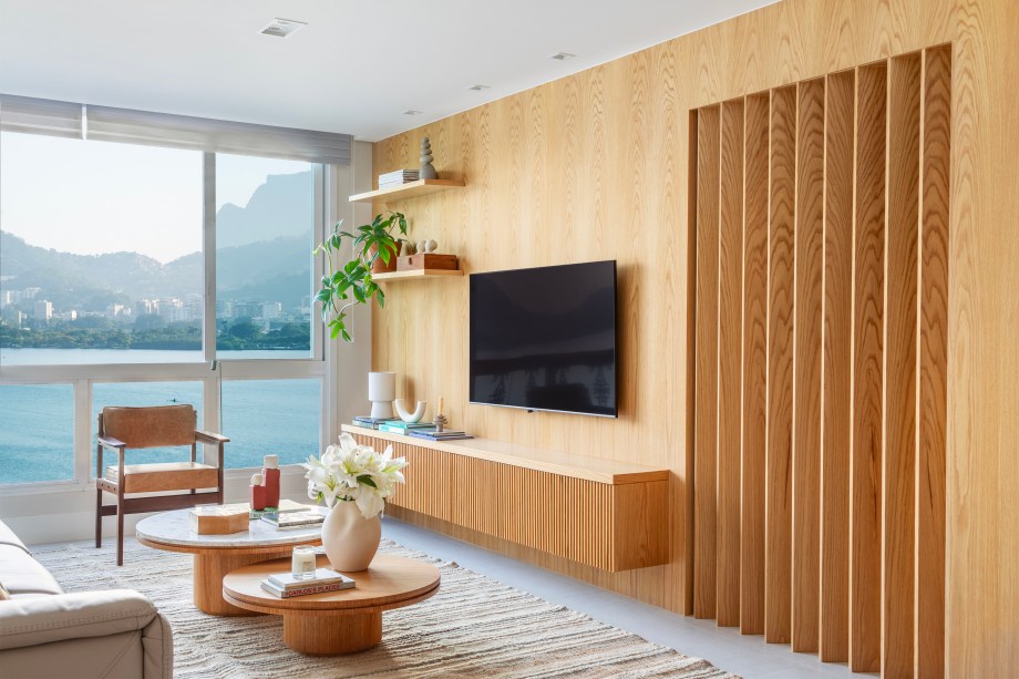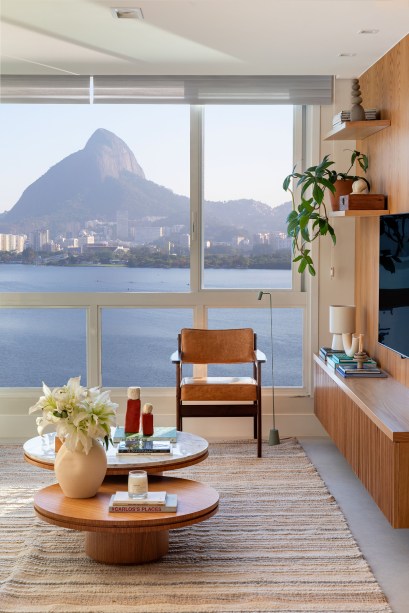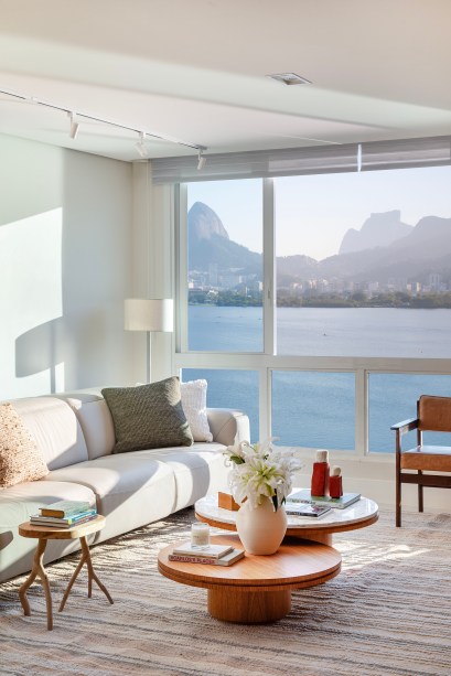 Segundo os arquitetos, a principal inspiração do projeto foi a vista deslumbrante da Lagoa, que adentra os cômodos, transformando suas janelas em quadros vivos. Para não tirar o protagonismo do cartão postal da capital carioca, a dupla apostou em tons claros e neutros combinados com carvalho natural. “As cores aparecem de forma pontual, especialmente em almofadas e adornos”, ressalta Tânia.
