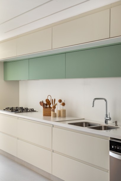 “Na cozinha, decorada em tons de menta, cinza claro e madeira, criamos uma ilha que funciona como copa e também serve de apoio para degustação de vinhos e entradas antes das refeições na mesa de jantar”, diz Bernardo.