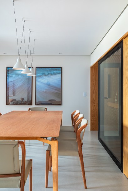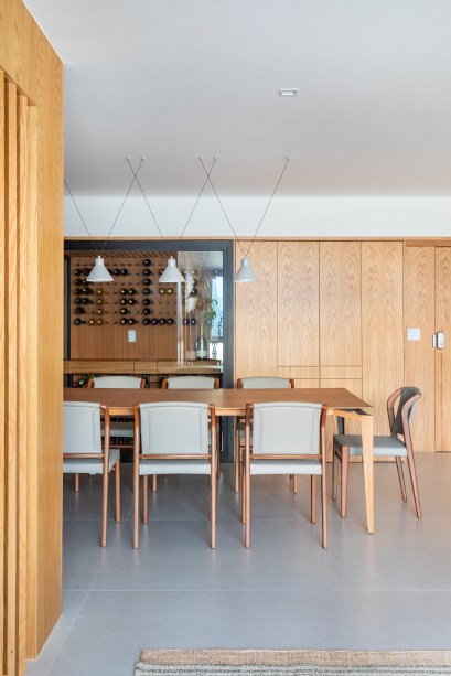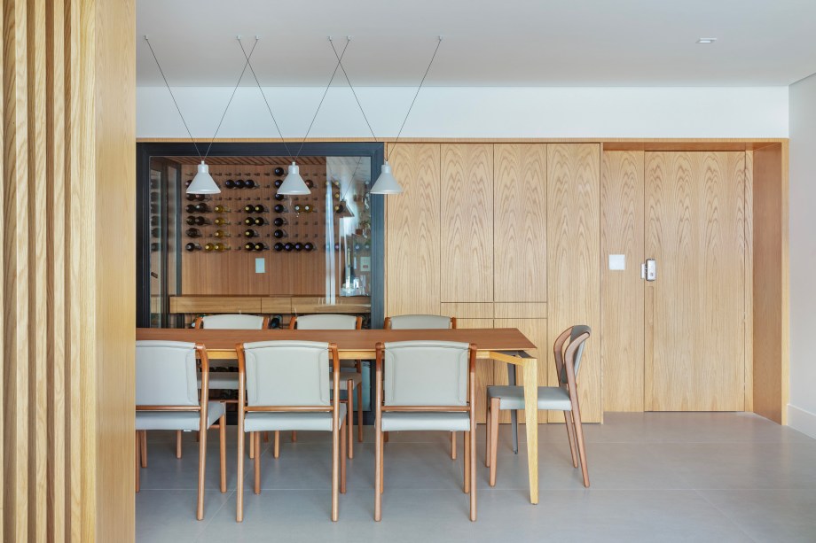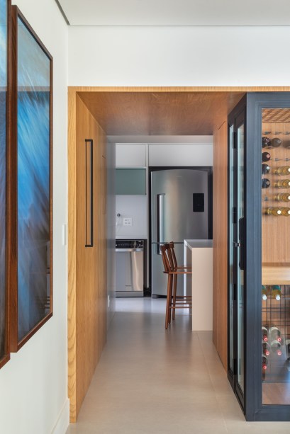 Como o cliente tem paixão por vinhos, os arquitetos projetaram um grande bloco de marcenaria em toda a extensão da parede da atual sala de jantar para acomodar uma super adega-vitrine climatizada (com capacidade para 300 garrafas), com portas de madeira na lateral que camuflam o louceiro e a cristaleira. Essa mesma estrutura também delimita, de um lado, o hall de entrada e, do outro lado, a circulação que dá acesso à cozinha.