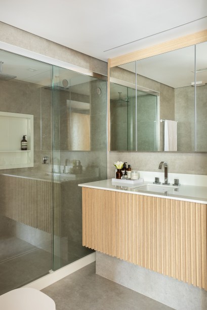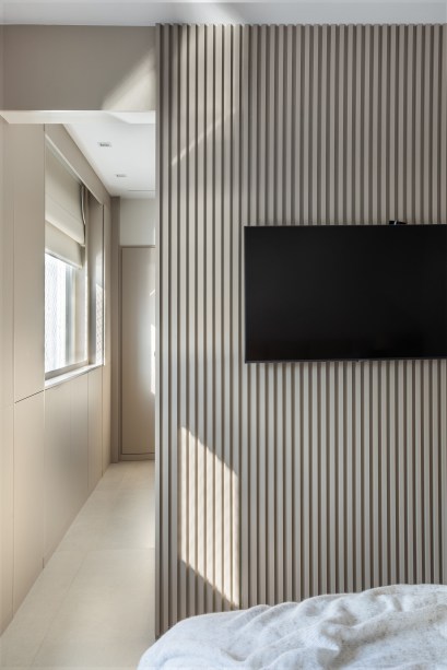 No geral, os clientes pediram um apartamento moderno, chique e despojado, em tons neutros e claros, e se mostraram dispostos a investir em marcenarias bem planejadas. Além disso, pediram para aumentar a suíte master (que resultou da união de dois quartos e permitiu ainda criar um closet e um banheiro mais amplo) e transformar um dos quartos em espaço multiuso – sala de TV, escritório ou quarto de hóspede – com portas de correr que permitem integrá-lo à sala principal.