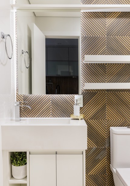 No banheiro, o destaque fica para porcelanato geométrico da parede, que compõe com as prateleiras e os nichos pensados para ajudar na organização.