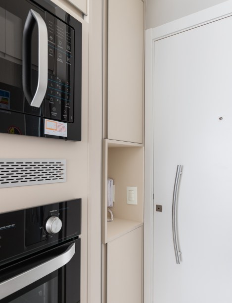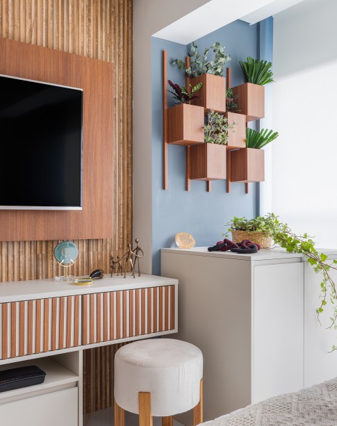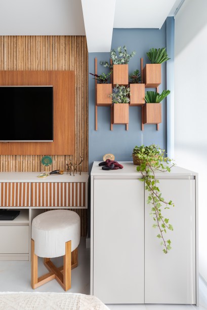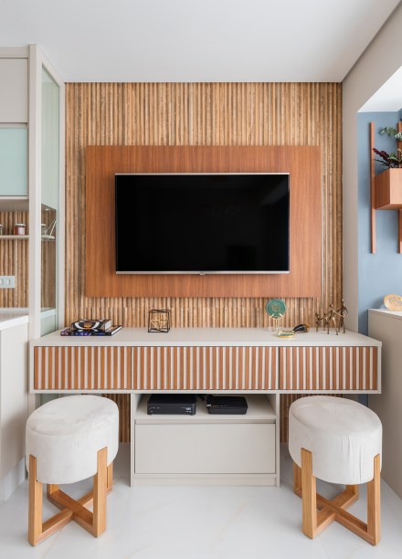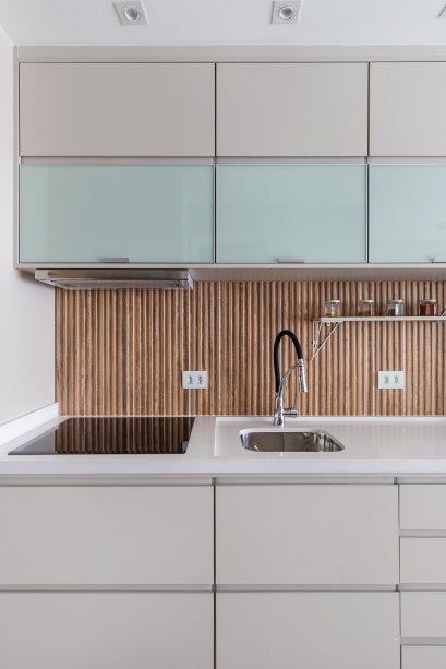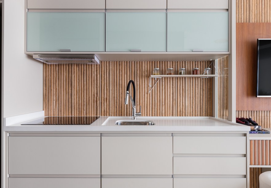 Destaque para o porcelanato do backsplash da pia – o mesmo utilizado no painel da TV – que se assemelha a ripas de madeira. Além da facilidade para a limpeza, passa a sensação de aconchego e dá movimento ao lar.