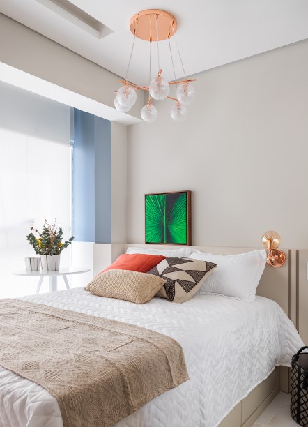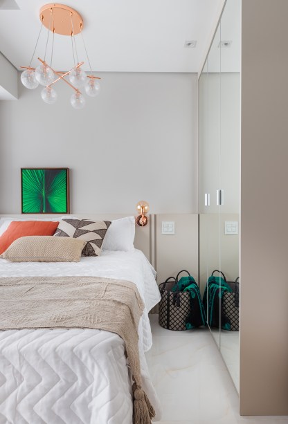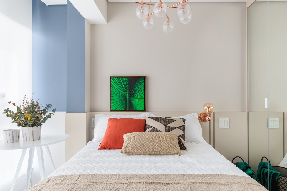 A marcenaria planejada ajudou a otimizar a área enxuta e alguns móveis soltos permitem versatilidade na circulação. A paleta de cores de base neutra proporciona amplitude visual e tons mais vivos foram adicionados nos objetos, como quadros e almofadas.