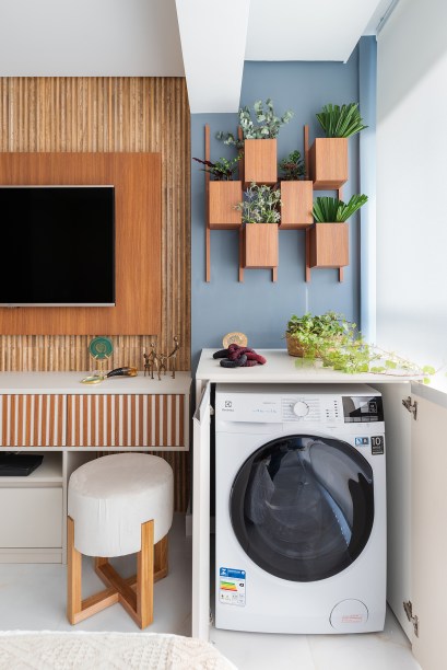 Diferente de muitos estúdios atuais, este aqui possui uma lavanderia: a máquina lava e seca fica totalmente camuflada quando não está em uso. Acima dela, na parede, os profissionais pensaram até num cantinho para abrigar as plantas da moradora.