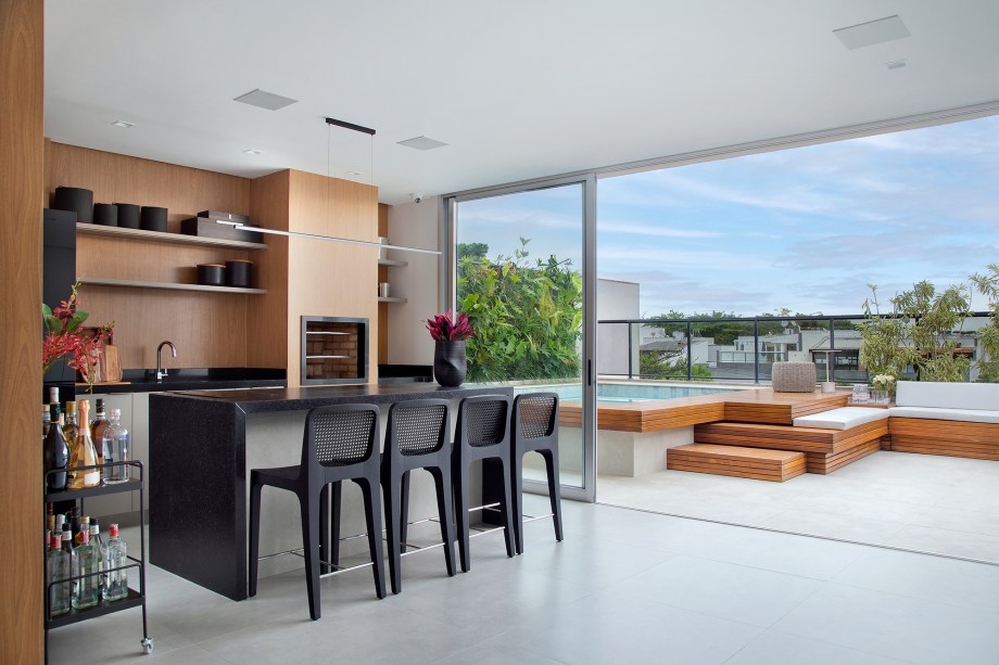 Um dos desejos dos moradores era que a cobertura fosse toda tecnológica. “Fizemos instalação de placas solares e toda a automação da casa: iluminação, som na área da piscina, cozinha e sala de televisão, câmeras, ar-condicionado e aparelhos do cinema. E o melhor: tudo controlado pelo iPad”, explica Tom.