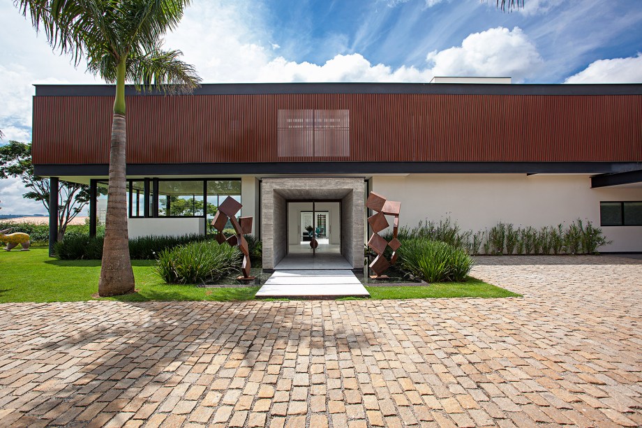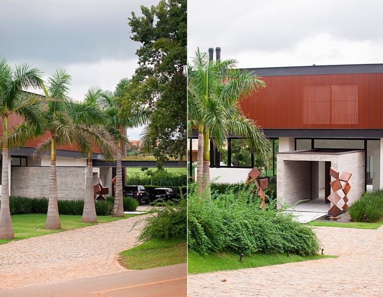 A entrada da casa é marcada por palmeiras-imperiais que ladeiam caminhos de paralelepípedos. Um espelho d’água rodeia o pórtico de entrada e canteiros de guaiambés e capim-azul criam volumes. “É um jardim de área ampla, como um parque, que não esconde a arquitetura da casa”, explica Riscala.