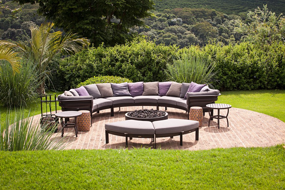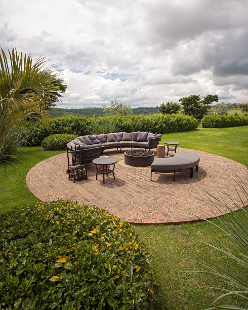 A área da lareira é rodeada por grama-esmeralda e canteiros que trazem privacidade.