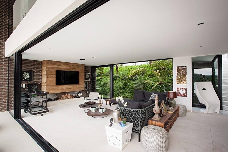 Toda essa área verde também serve de pano de fundo para a sala de TV no andar de baixo – as portas de vidro e o ângulo do terreno criam a inusitada ilusão de uma parede verde com palmeiras.