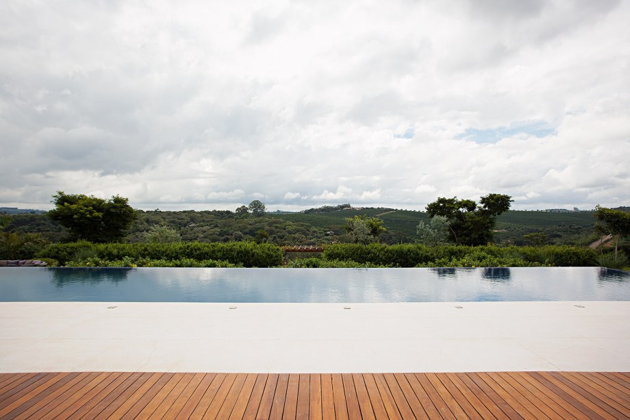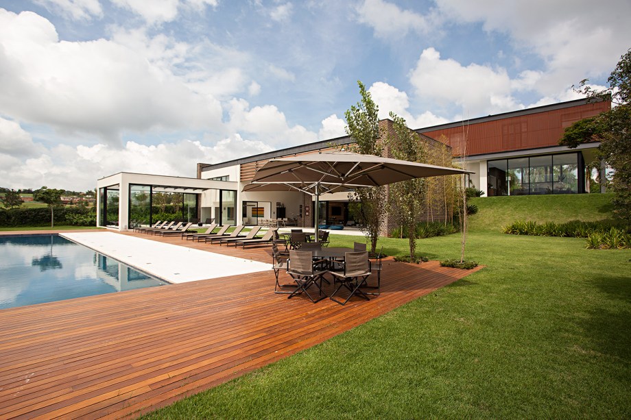 Como o terreno é em desnível, a casa foi dividida em três platôs: a entrada e a parte social ficam no nível da rua, a piscina no eixo central e, na parte mais baixa, um estar foi criado sob o pergolado.