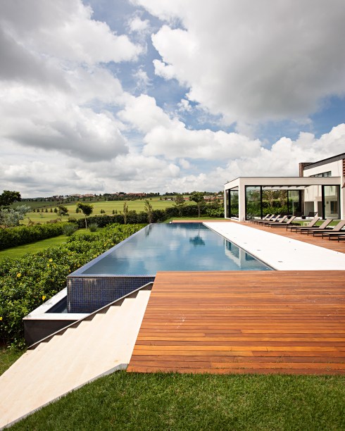 A piscina de borda infinita é elevada no terreno e sua parede fica exposta. Para camuflar a estrutura, canteiros de alamandas criam um desenho sinuoso e disfarçam o desnível.