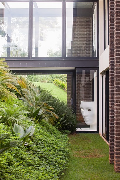 As áreas livres são amplamente exploradas na parte lateral desse primeiro nível, onde as paredes de vidro do living criam uma conexão interna-externa e ainda destacam um elemento único do projeto todo: a escultura assinada por Gustavo Rosa. “Foi a última escultura que ele fez em vida”, relembra o paisagista.