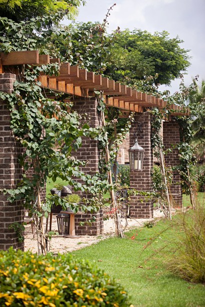 Por fim, no nível mais baixo do terreno, um canto de estar foi criado sob o pergolado. As colunas de tijolo inglês ganharam uma cobertura de cumaru, que abriga trepadeiras primavera e sete-léguas. Pedriscos no chão deixam o espaço mais aconchegante.